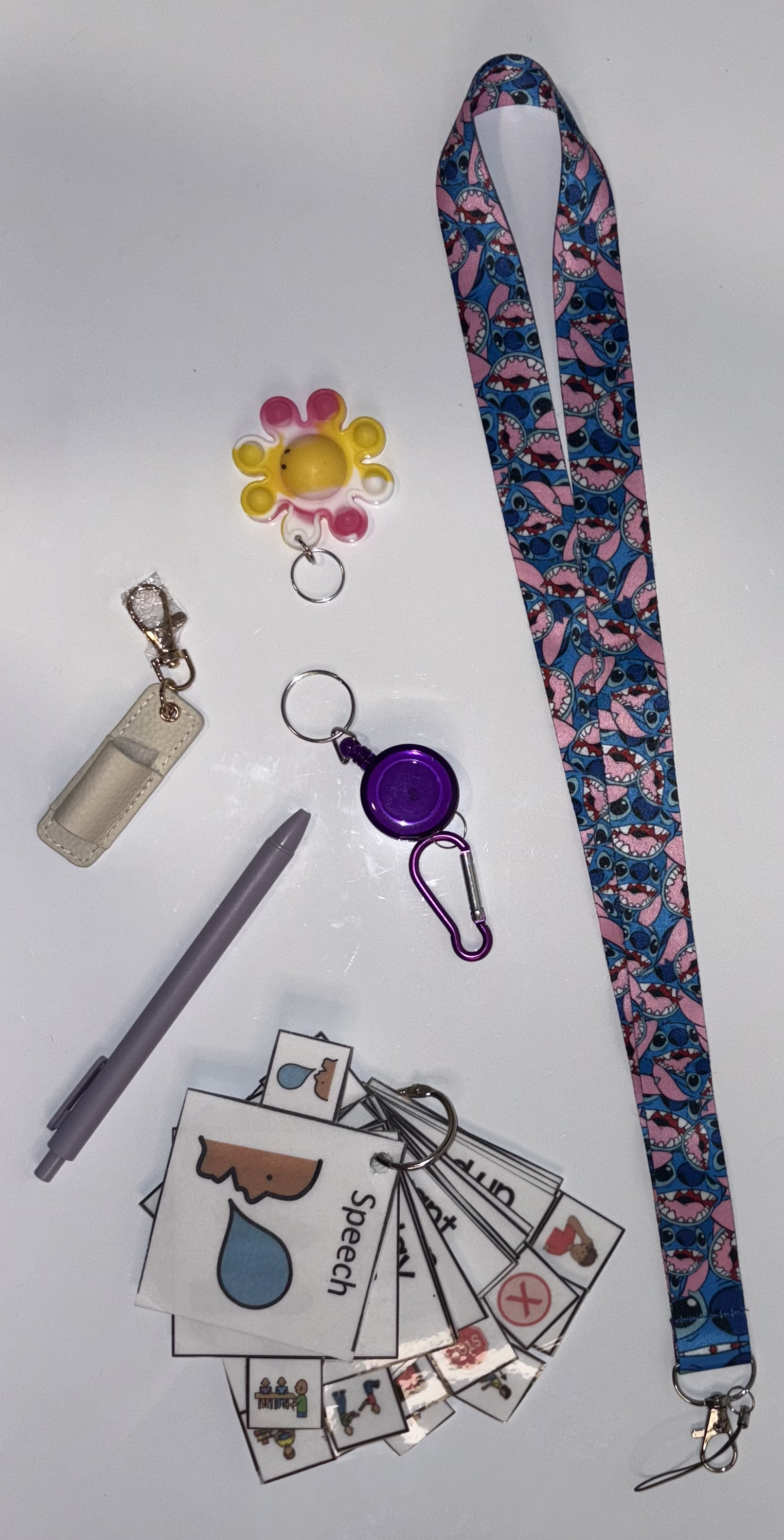 Support communication, focus, and data collection all in one with this all-in-one Multimodal Communication Lanyard! Designed for students of all ages, especially those with autism or sensory needs, this lanyard includes a built-in calming fidget tool to reduce anxiety and increase focus, plus a secure pen holder for quick note-taking or data tracking during sessions. Ideal for parents, speech-language pathologists, teachers, aides, and therapists who value both accessibility and function. Promote regulation, engagement, and ease with this classroom, home and clinic-ready tool.